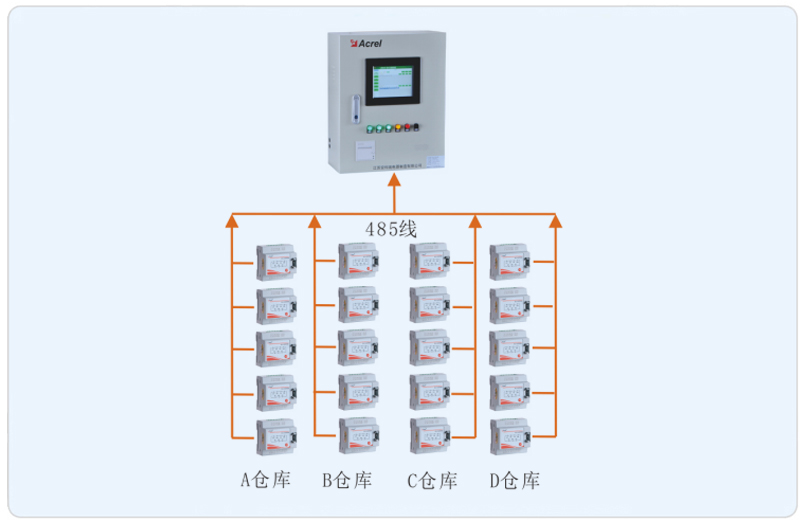 系統采用安科瑞消防電源監控系統,該系統主要采用分層分布式網絡結構,系統結構爲:站控管理層、網絡通訊層和現場設備層。其中廣陳第三方電子商務平台托管産業基地現場設備分布爲A、B、C、D倉庫以及綜合辦公用房消防配電回路。該系統監控所有消防配電櫃内消防回路雙電源的實時運行狀态,如有異常會後台報警。所有監測模塊通過485總線鋪設至消防控制室,消防電源監控主機從而完成對監測模塊的采集并監控。