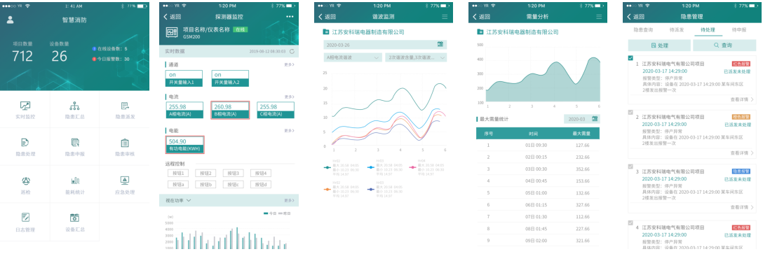 APP支持Android、iOS操作系統,方便用戶查看電氣火災、防排煙、消防水、消防設備電源、防火門、消防設備管理、視頻 監控、火災報警等子系統的實時監控數據、報警信息、能耗統計等。