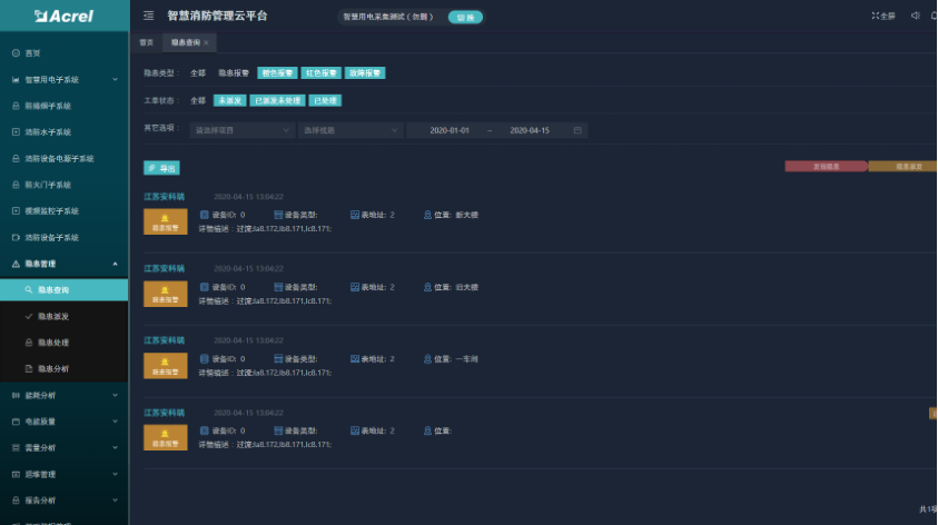 隐患管理功能包括了隐患查詢、隐患派發、隐患處理和隐患分析四個模塊。可以查看登錄用戶下的所有項目的隐患信息,并進行派發和處理操作,且對所有隐患進行統計分析。